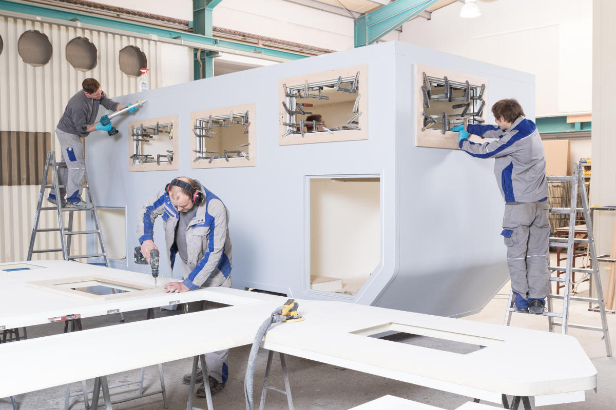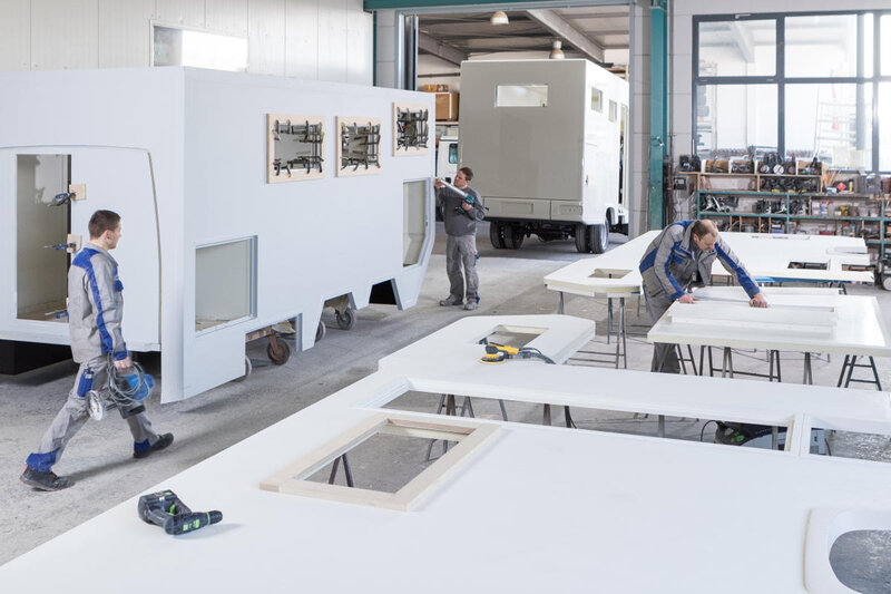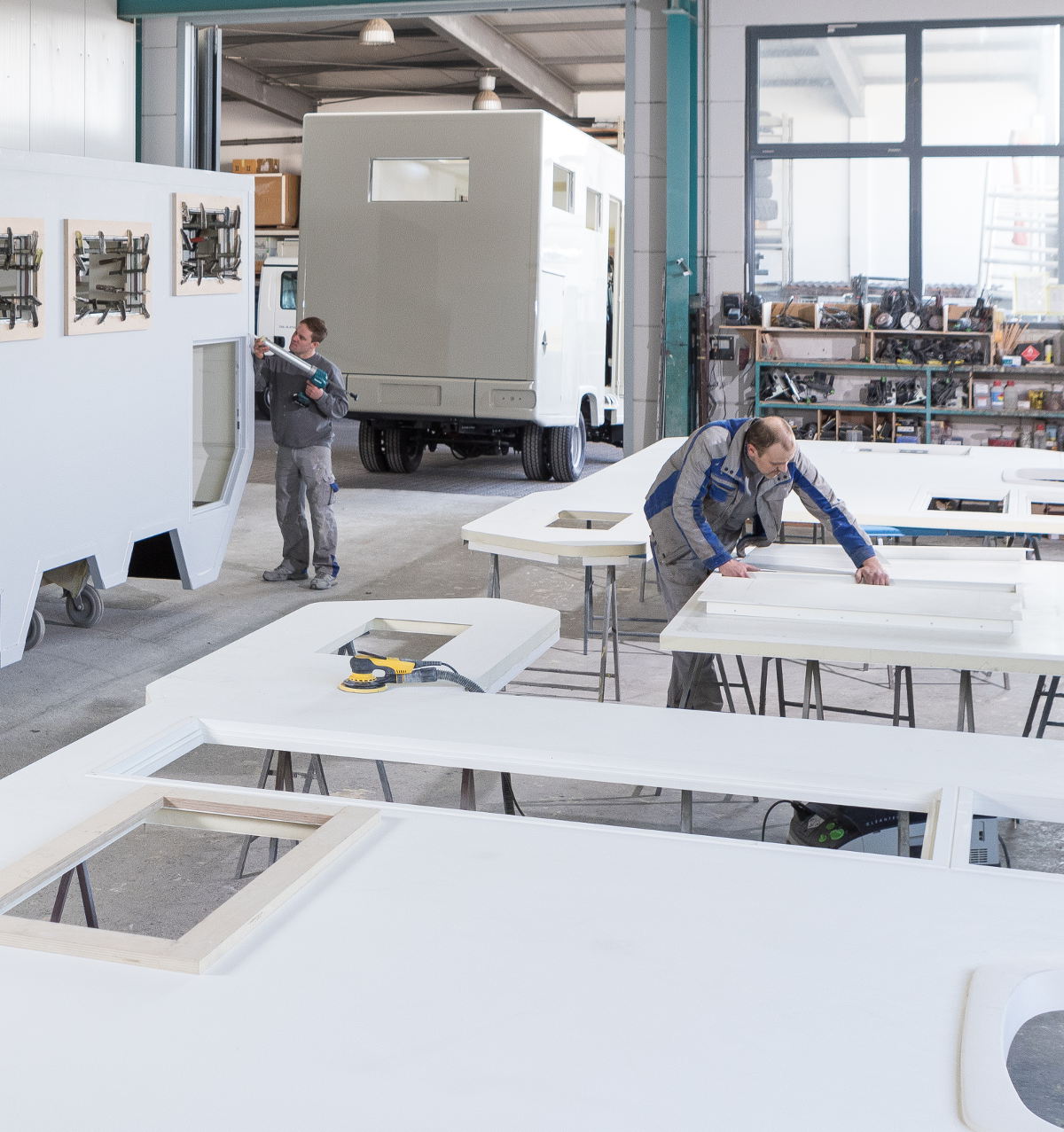 Nach der Abstimmung und Planung beginnt der Bau Ihres bocklet Mobils. Dabei wird zunächst das Fahrgestell vorbereitet und der Hilfsrahmen bzw. die Aufbaulagerung angefertigt. Danach beginnen unsere Karosseriebauer mit der Produktion der GFK (glasfaserverstärkter Kunststoff)-Sandwichplatten in der eigenen Pressanlage. So gewährleisten wir die bekannte Qualität der bocklet Kabinen und können individuell und flexibel auf Ihre Anforderungen reagieren.