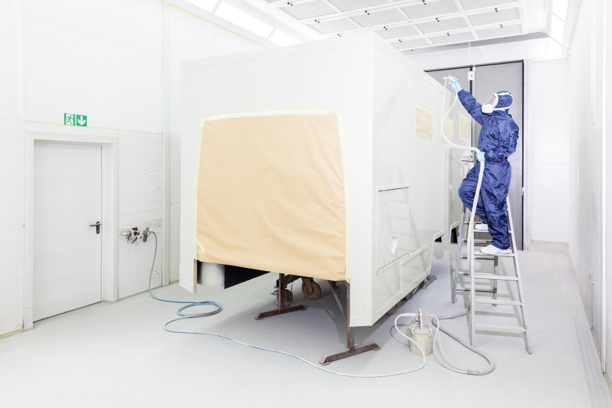 Die GFK-Kabinen sind unempfindlich gegen Hagel und extrem schlagresistent. Unfallreparaturen und Instandsetzungen sind schnell und kostengünstig möglich. Entsprechend der CAD-Daten fräsen die Mitarbeiter Ausschnitte für Fenster und Dachluken in die GFK-Platten. Die Türen und Klappen mit den bocklet-eigenen, exklusiven Griffmulden und GFK-Profilen sowie Mehrfachverriegelungssystemen werden individuell angefertigt. Nahezu alle Formen und Größen sind realisierbar. Hochwertige Eckverbindungen mit Rund- oder Winkelprofilen außen und innen garantieren einen robusten, langlebigen und absolut dichten Aufbau. Die großflächige Verklebung aller Bauteile mit modernen Klebstoffen und die fachgerechte Verarbeitung sorgen für enorme Stabilität. Die verwindungssteifen und selbsttragenden Kabinen werden nach dem Zusammenbau in unserer modernen Großraum-Lackieranlage lackiert, bevor die eigentliche Hochzeit, die Montage der Kabine auf dem Fahrgestell, erfolgt.