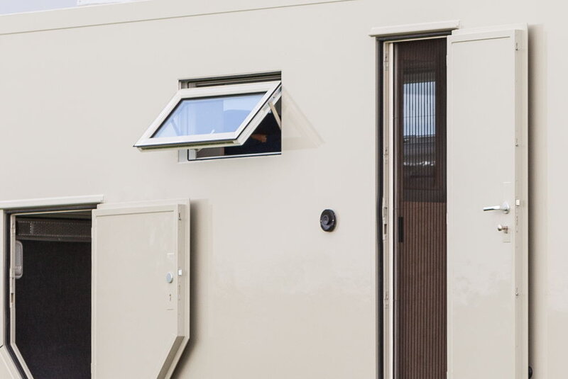 Der Einbau von einbruchshemmenden, kältebrückenfreien Isolier-Hartglasfenstern, die flächenbündig in die Kabinen Seitenwände eingebaut sind, ist ein weiteres Merkmale eines bocklet Aufbaus. Für diese Fenster sind zusätzliche Edelstahlabdeckbleche erhältlich um das Fahrzeug bei längeren Standzeiten zu schützen.