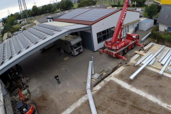 Eine große Überdachung der Hoffläche wird gebaut und bietet nun auch für kurzfristige Servicearbeiten eine wettergeschützte Arbeitsfläche. Zudem können Fahrgestelle geschützt abgestellt und gelagert werden.